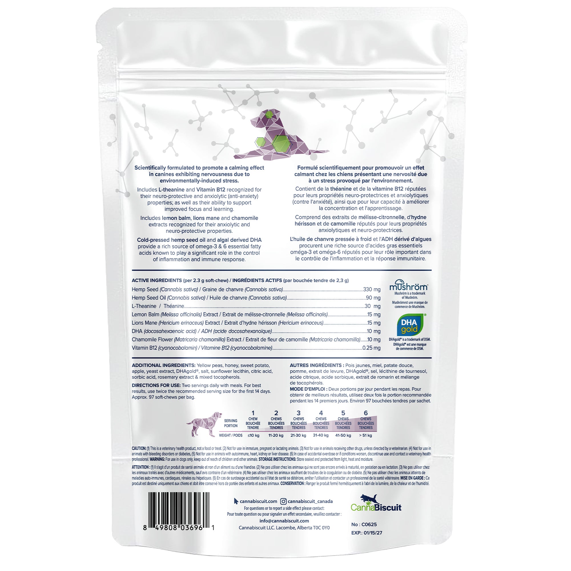 Includes lemon balm, lions mane and chamomile extracts recognized for their anxiolytic and neuroprotective properties. Each 225g bag contains approximately 97 soft chews.